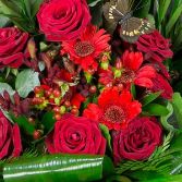 A stunning modern 'front facing' bouquet which is filled with rich red roses and luscious berries making a truly show stopping piece. Full of texture and detail, this bouquet is a beautiful gift for that extra-special someone.